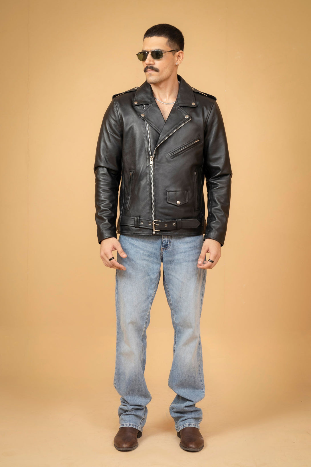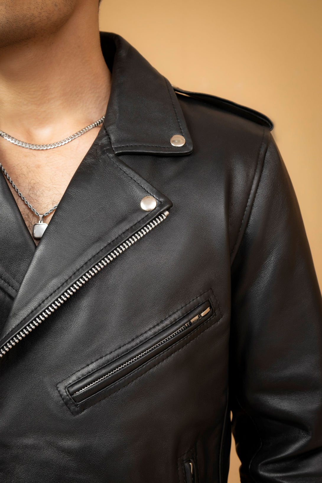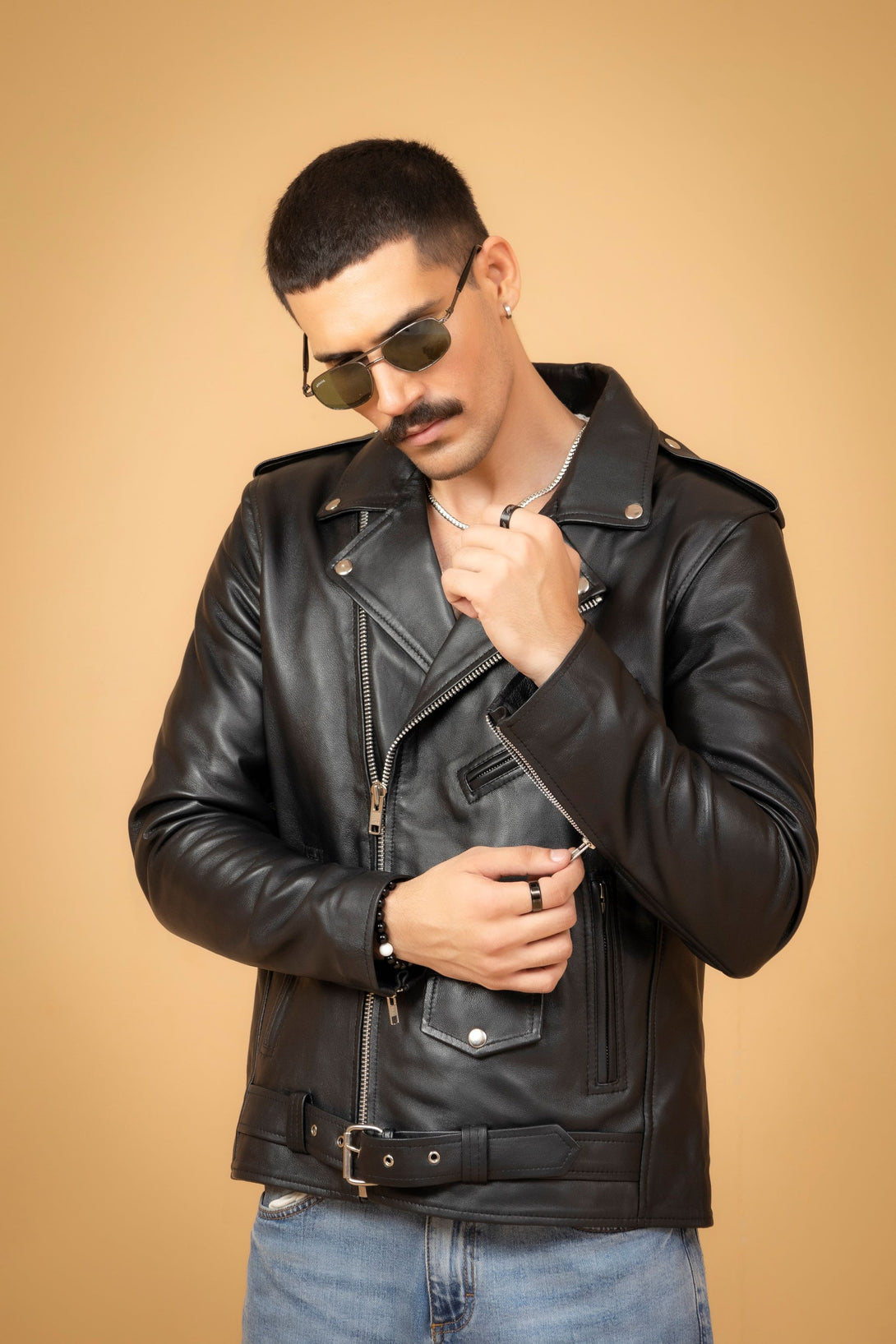 Crafted from premium black leather, this asymmetrical moto jacket offers a distinctive silhouette that balances edgy style with expert tailoring. Designed for durability and comfort, it features a unique angled front zip and structured fit that enhances mobility while making a bold statement. Ideal for those seeking a versatile yet standout outerwear piece, this jacket combines classic biker elements with a modern twist.