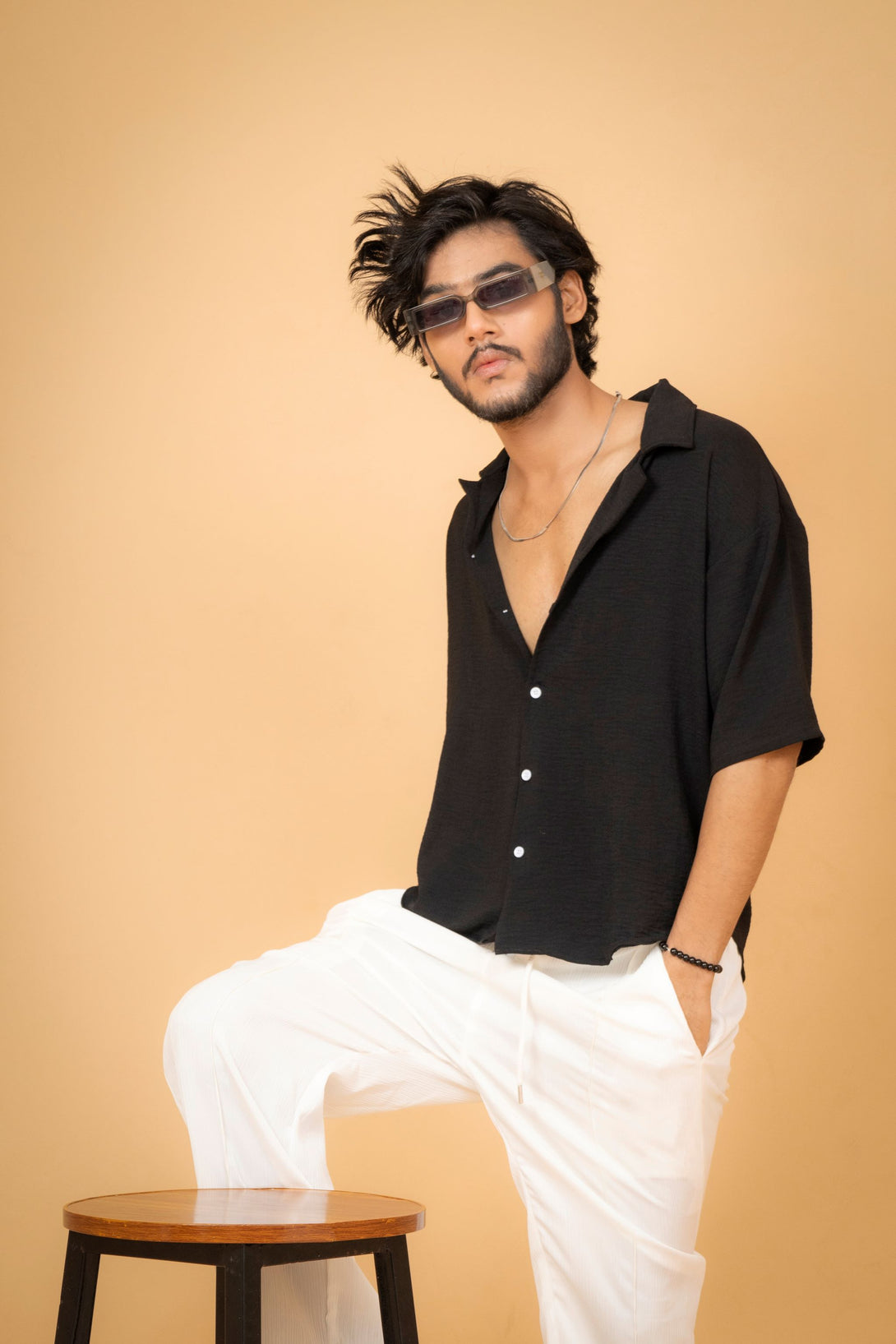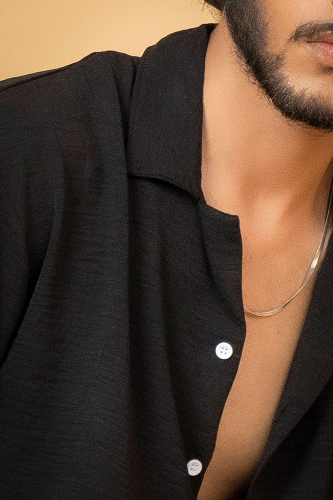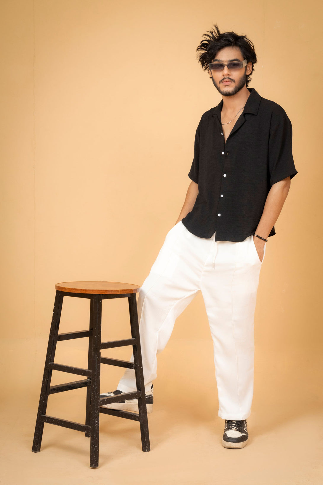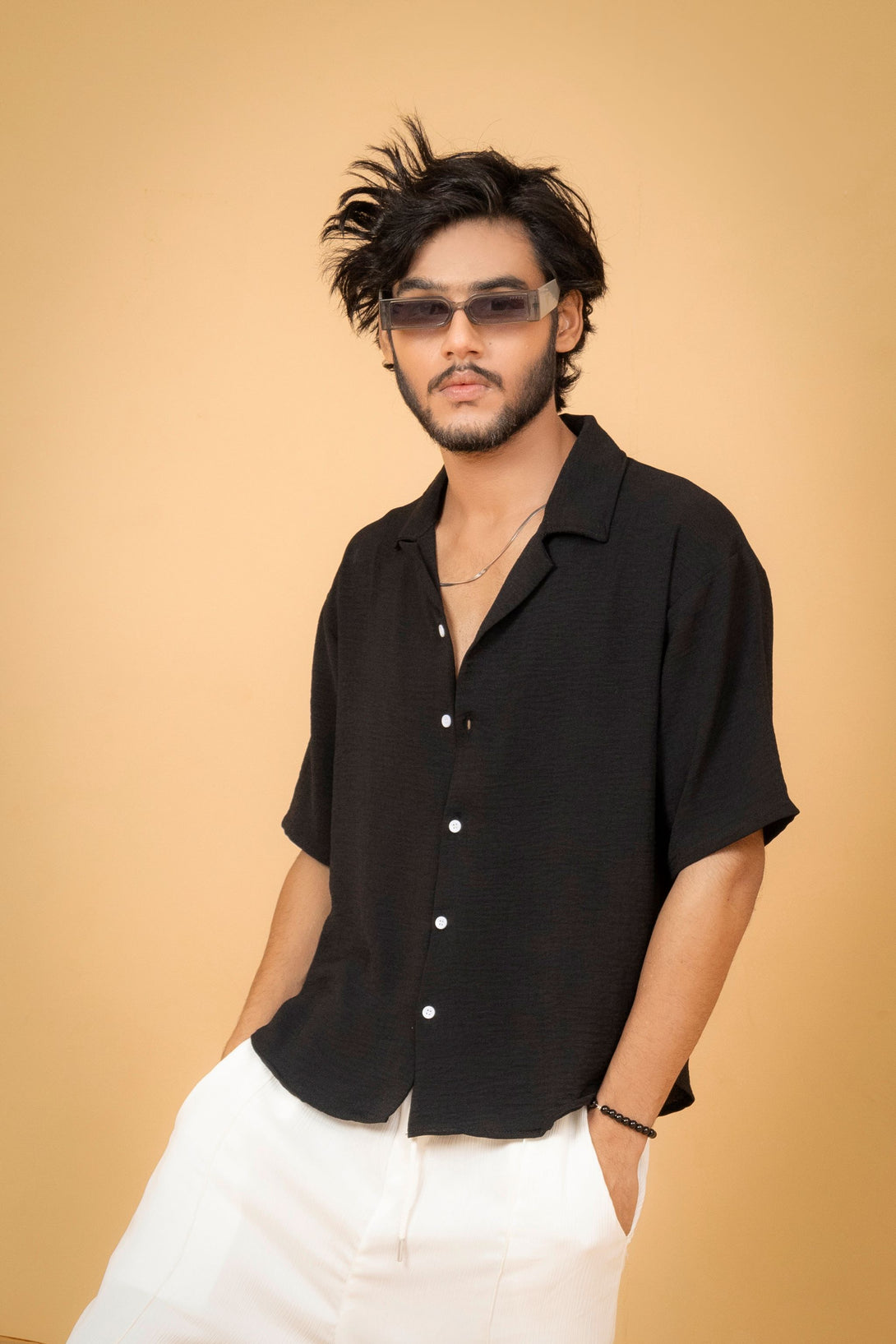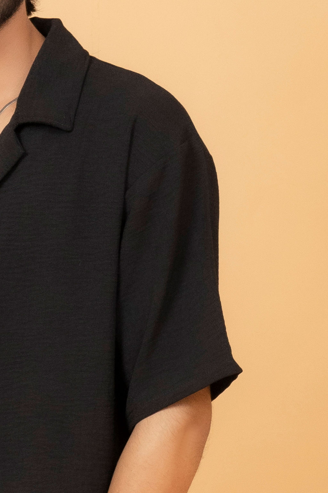 Features: Camp collar , short sleeves, button-front closure, subtle fabric texture.