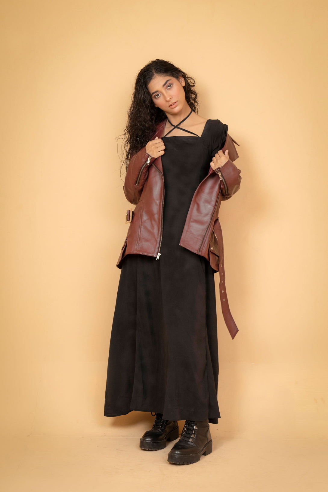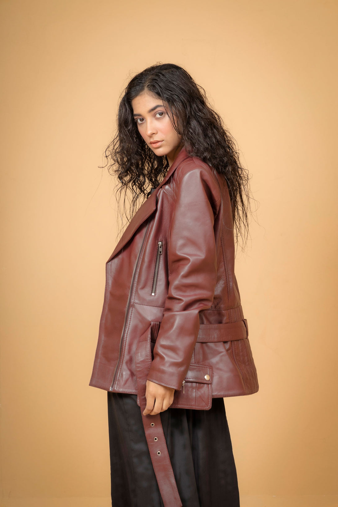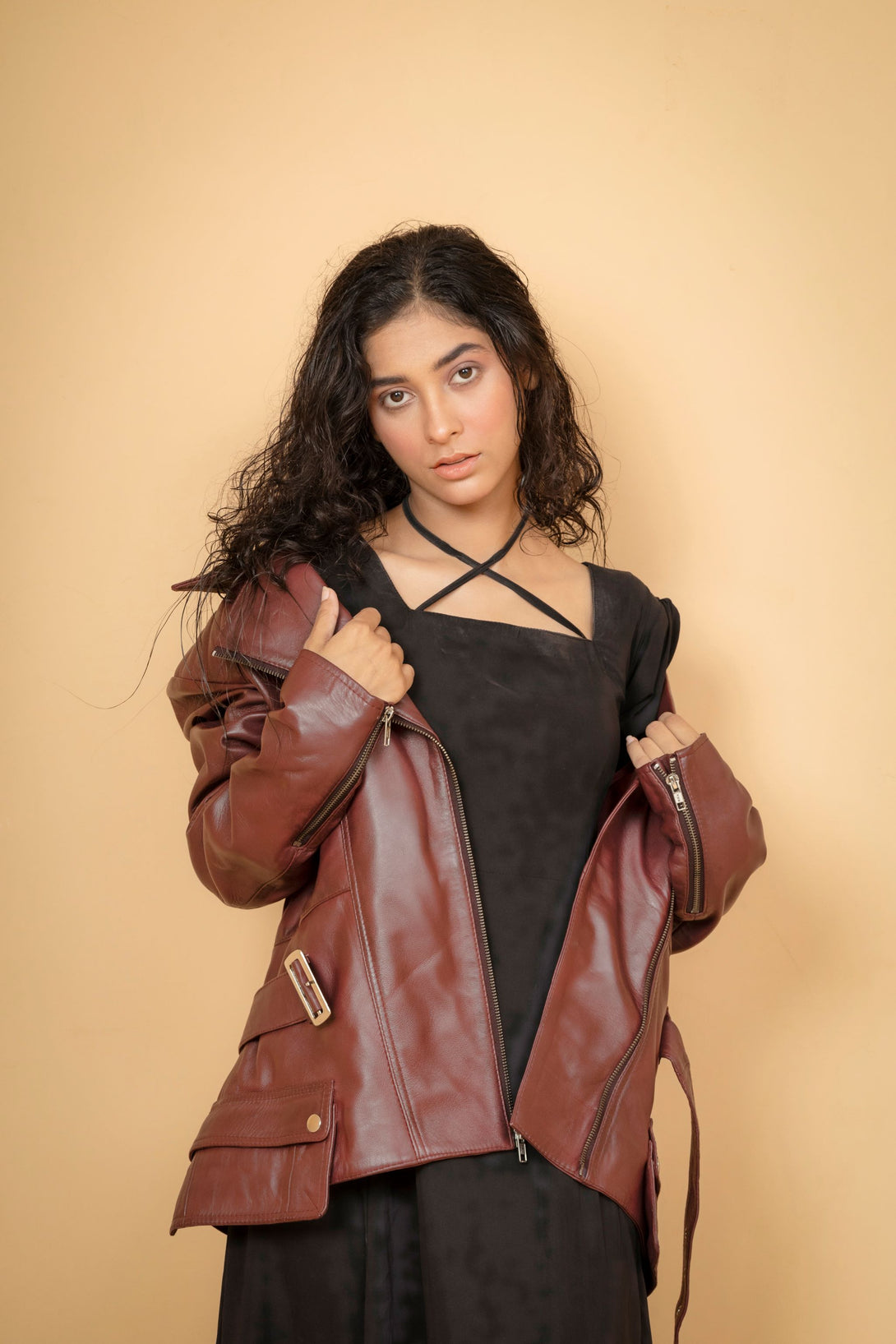 Elevate your style with this chic faux leather brown jacket, perfect for any casual or semi-formal occasion. Crafted from high-quality original leather, this jacket offers a luxurious look and feel while being ethically made. Its tailored fit accentuates the feminine silhouette, featuring a classic collar, front zipper closure, and stylish detailing. Whether paired with jeans for a casual outing or layered over a dress for a night out, this versatile jacket adds a touch of sophistication and edge to your wardrobe. Durable, comfortable, and effortlessly stylish, this faux leather brown jacket is a must-have for the modern woman.