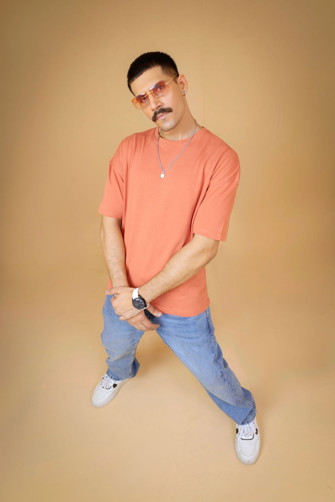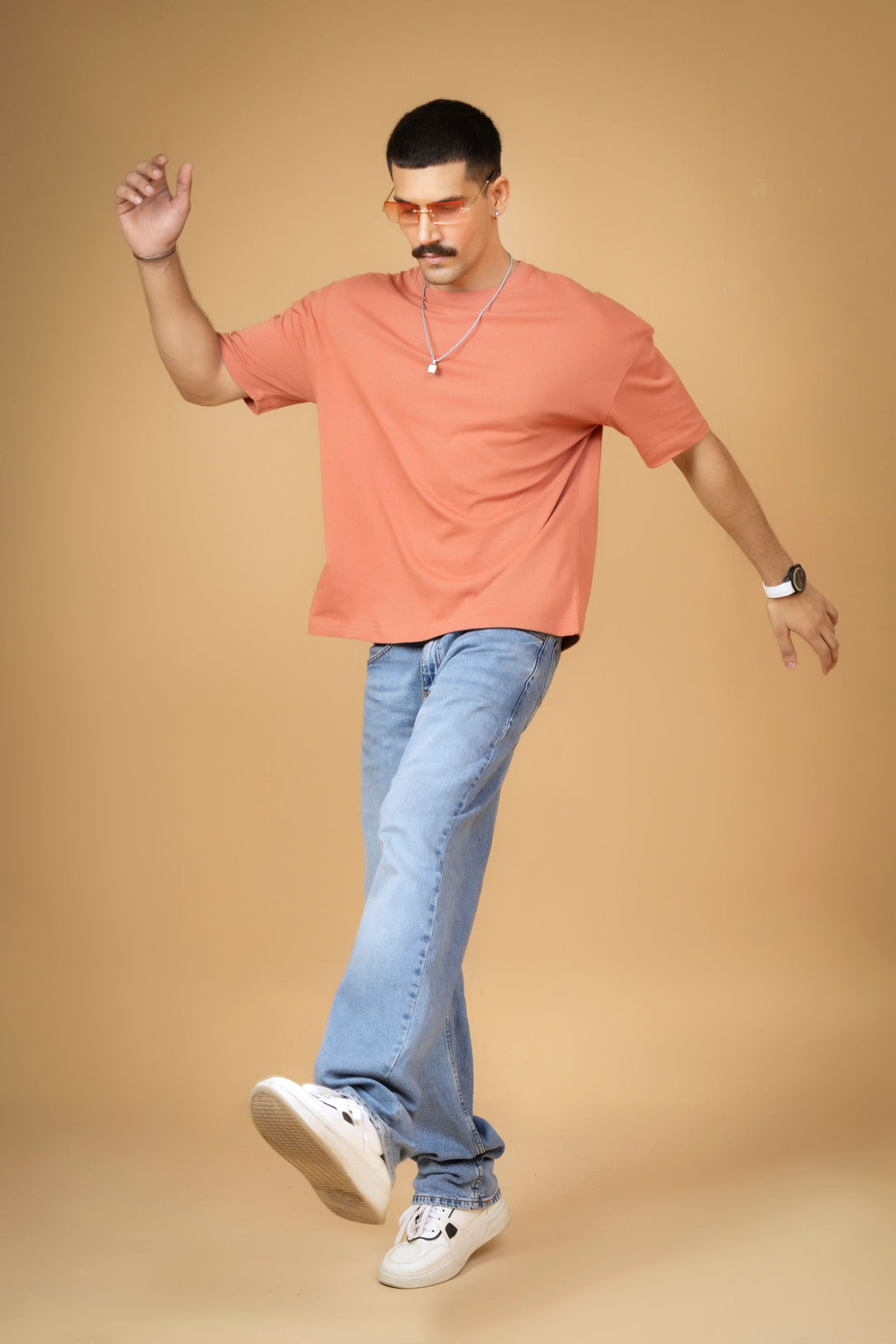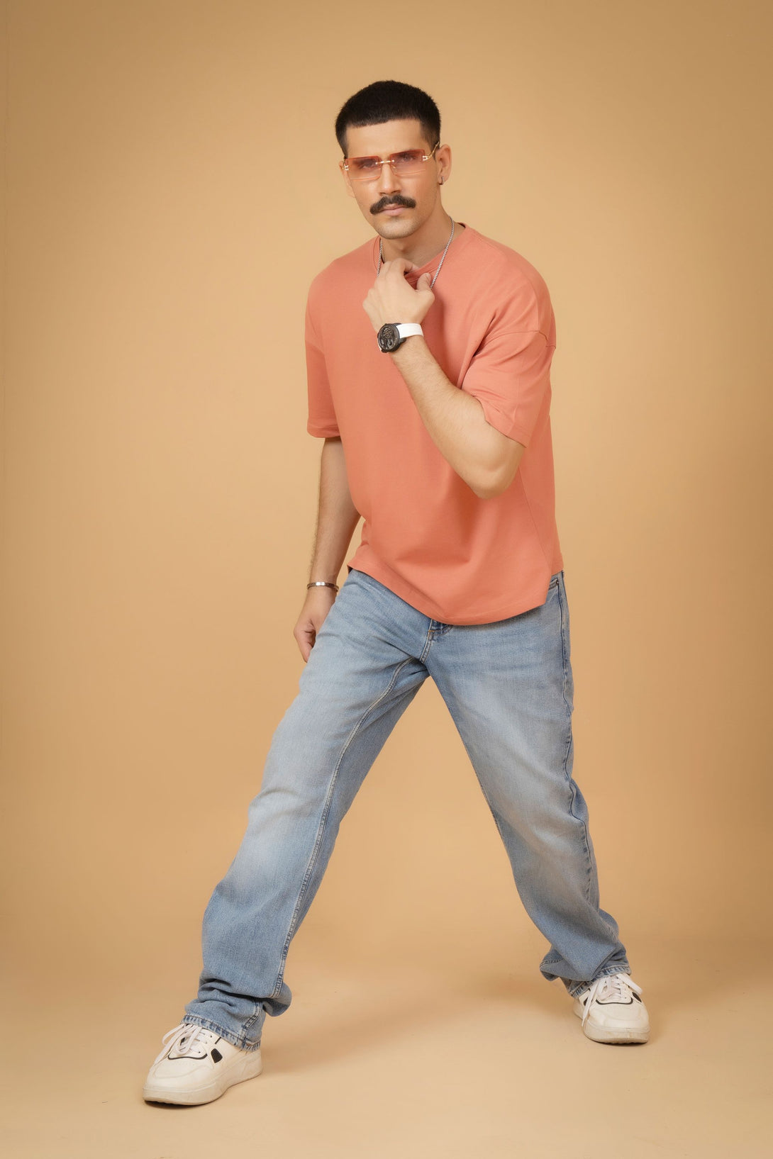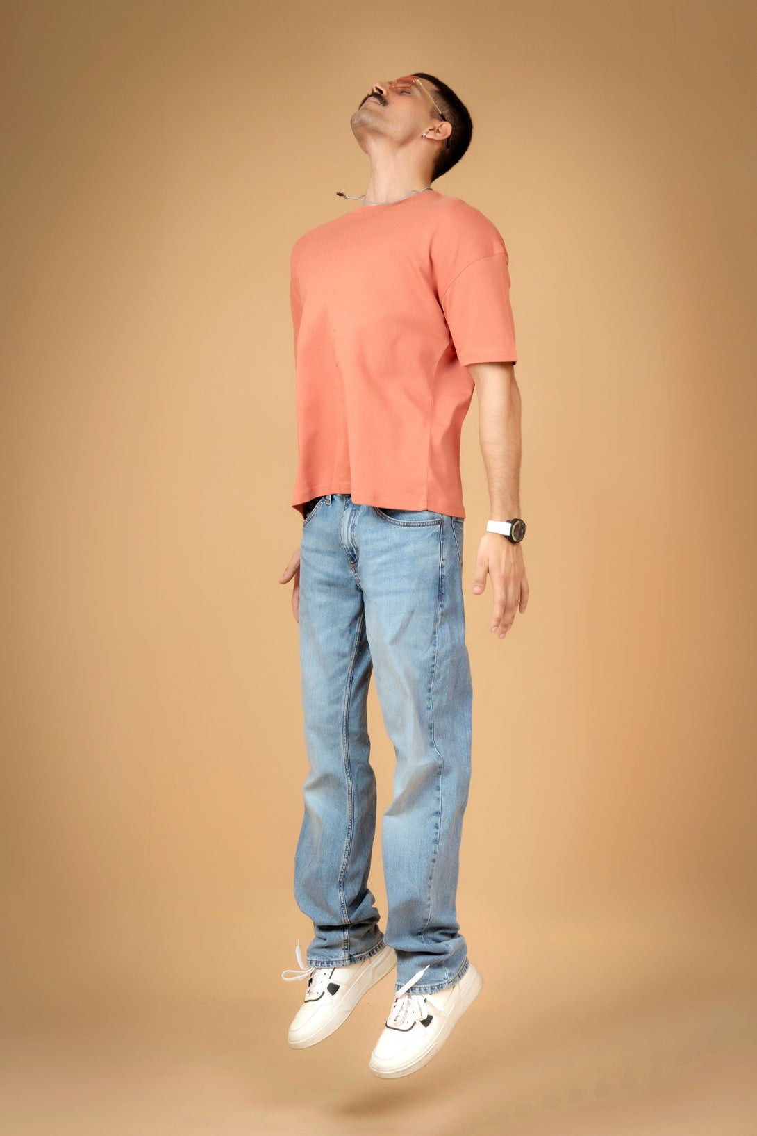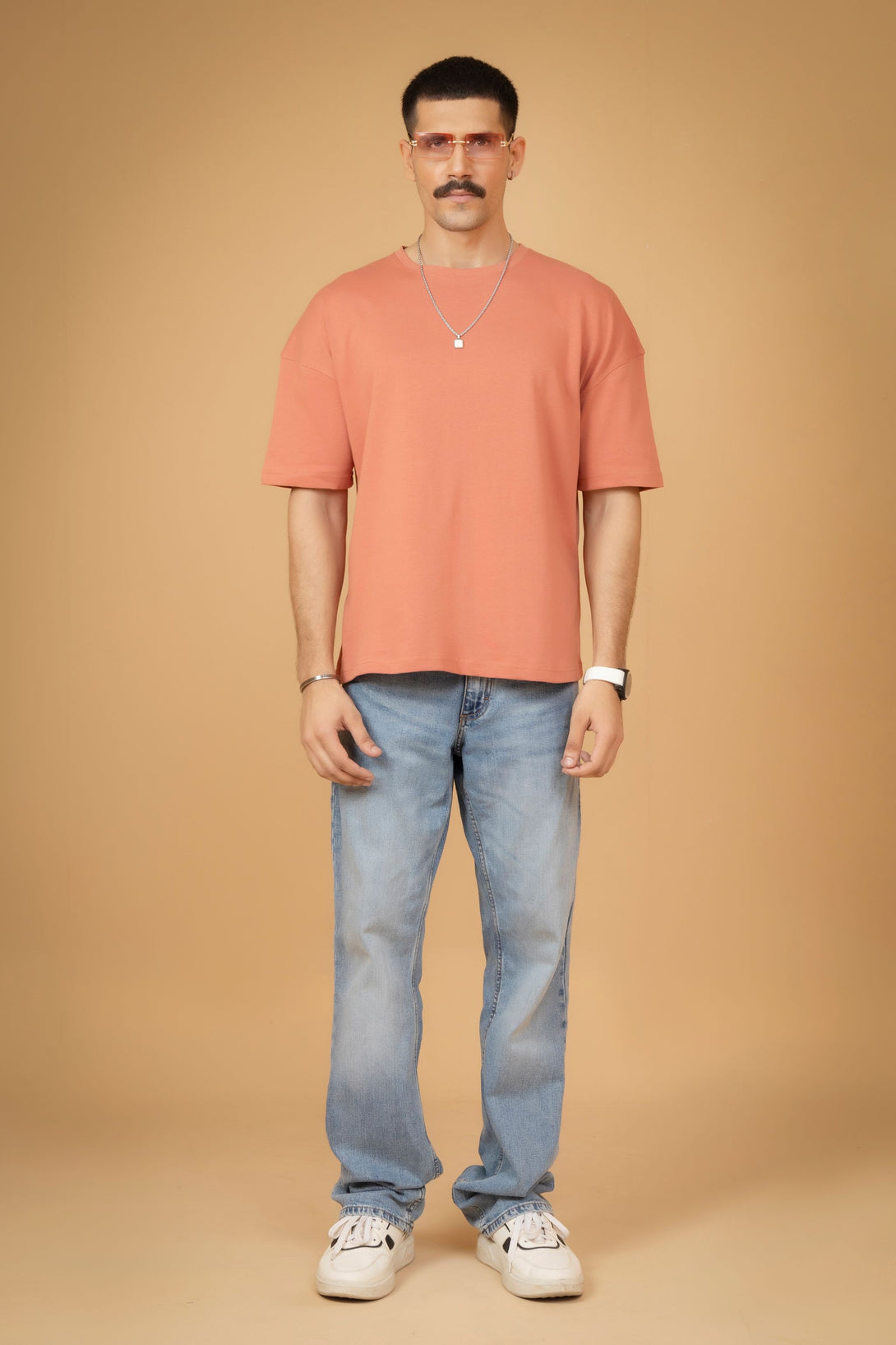 Add a pop of color to your wardrobe with this peach embroidered T-shirt featuring a stylish geometric back print. Designed with a relaxed drop shoulder fit, it's perfect for casual, comfortable everyday wear.