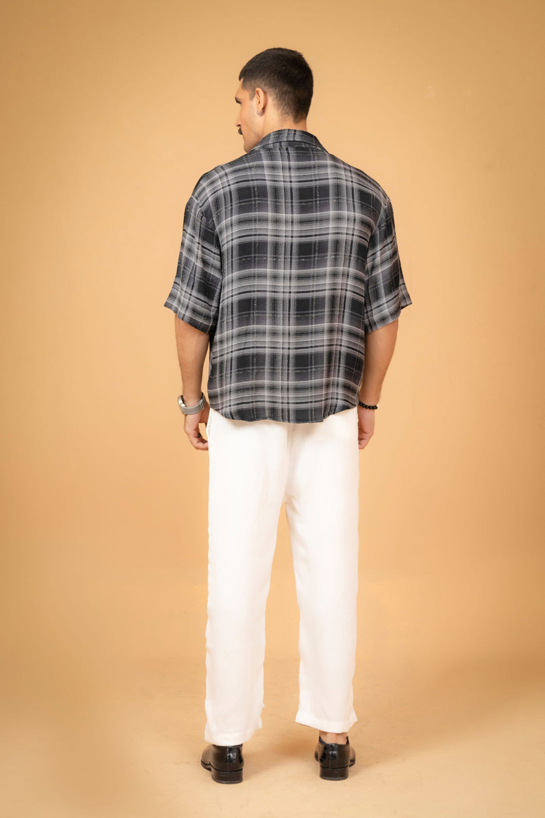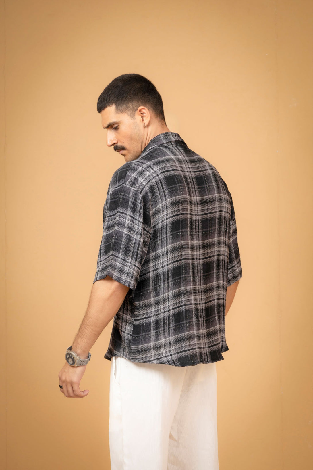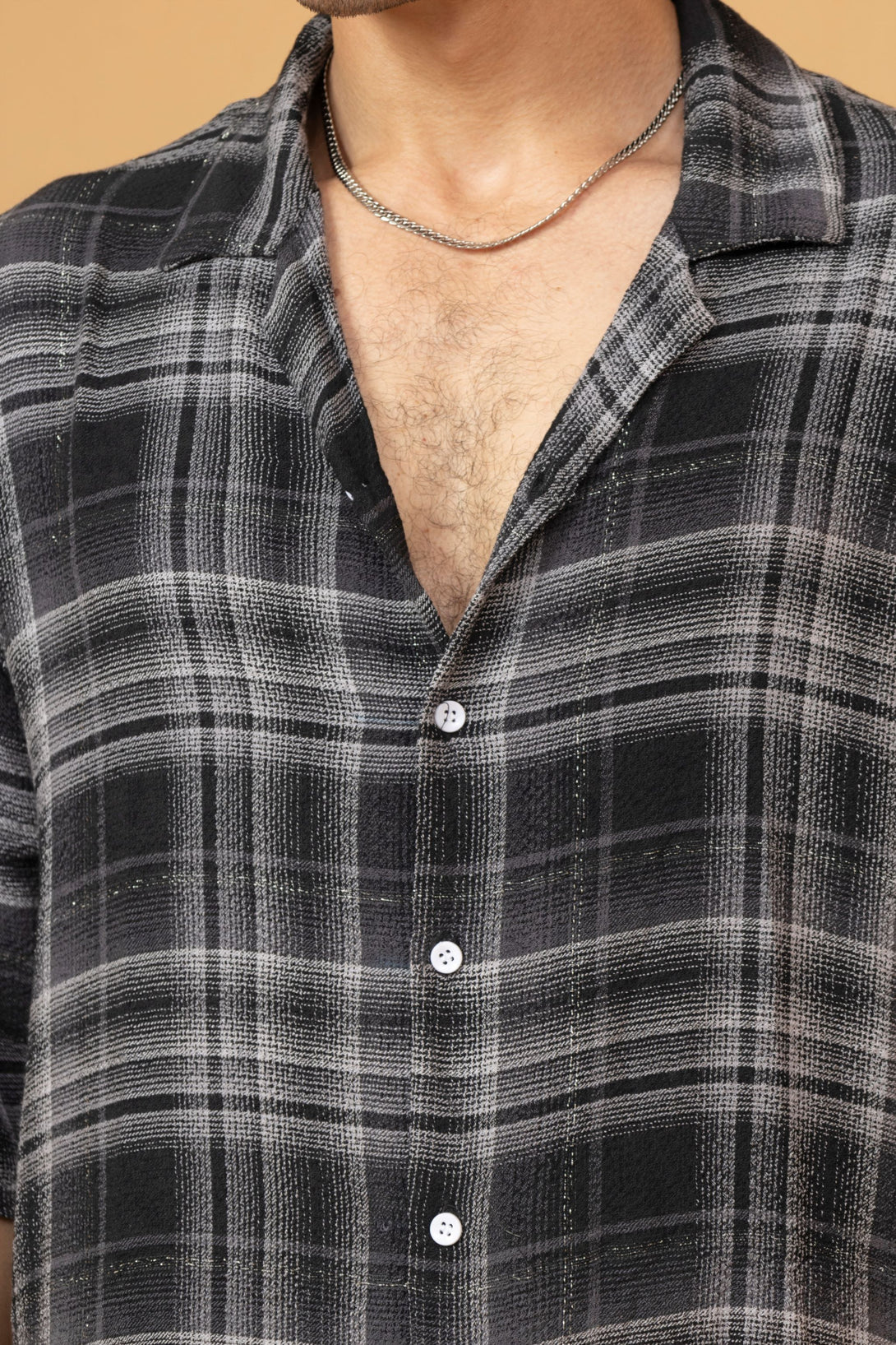 Color & Pattern: Black and dark gray plaid pattern with light gray accents.