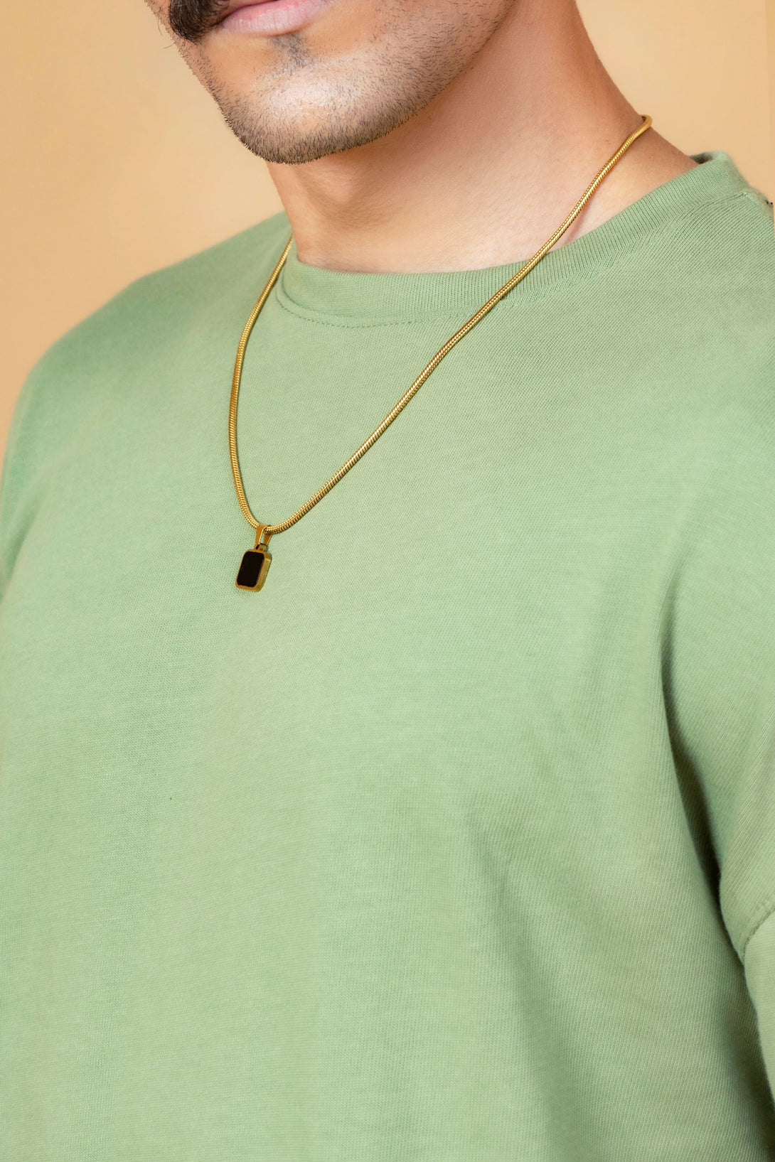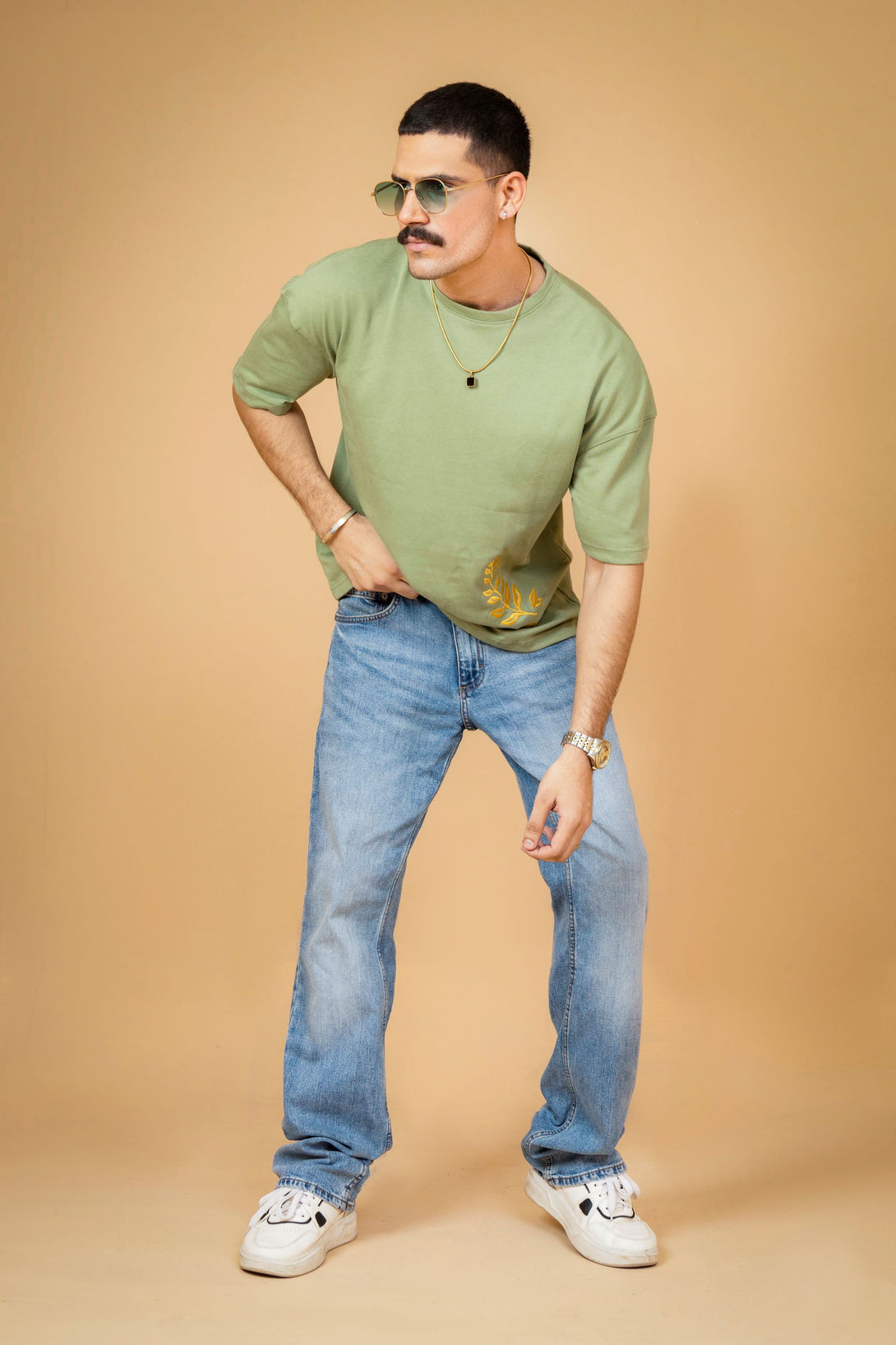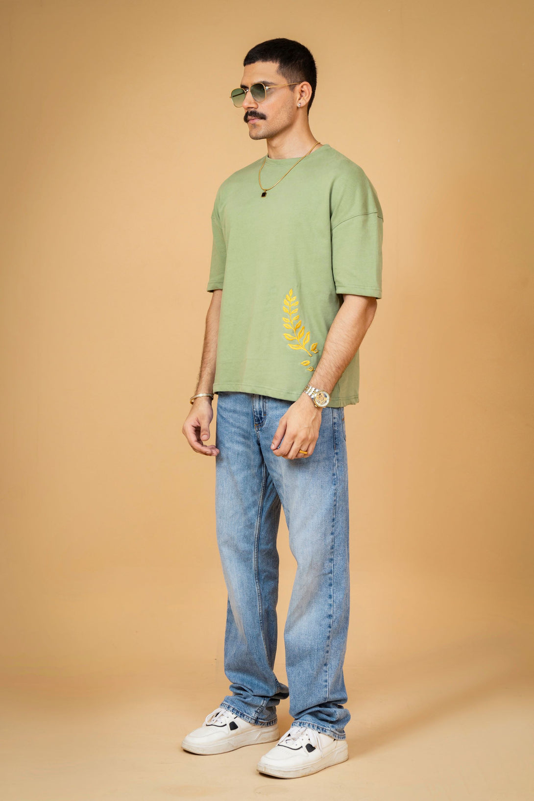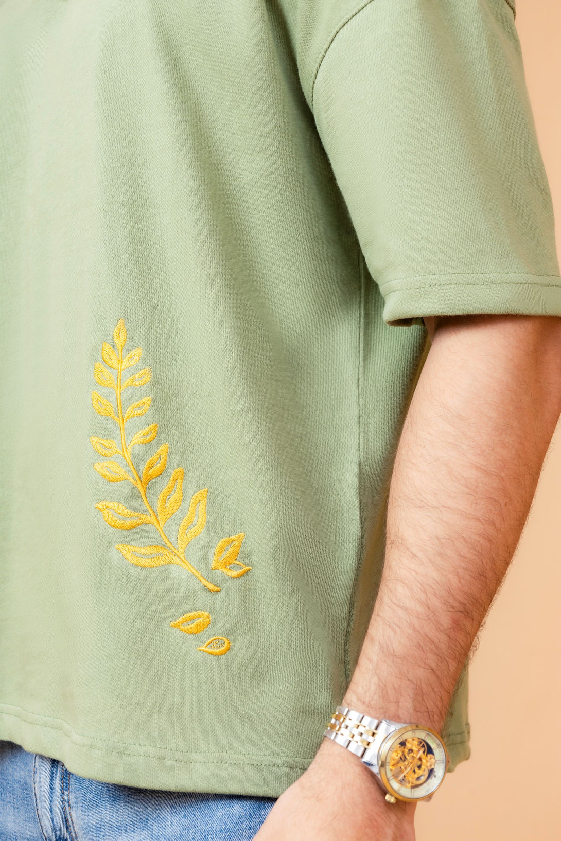 Front Design: Features a Yellow embroidered or printed Laurel Wreath/Leaf branch design placed on the lower left side of the chest/front hem.