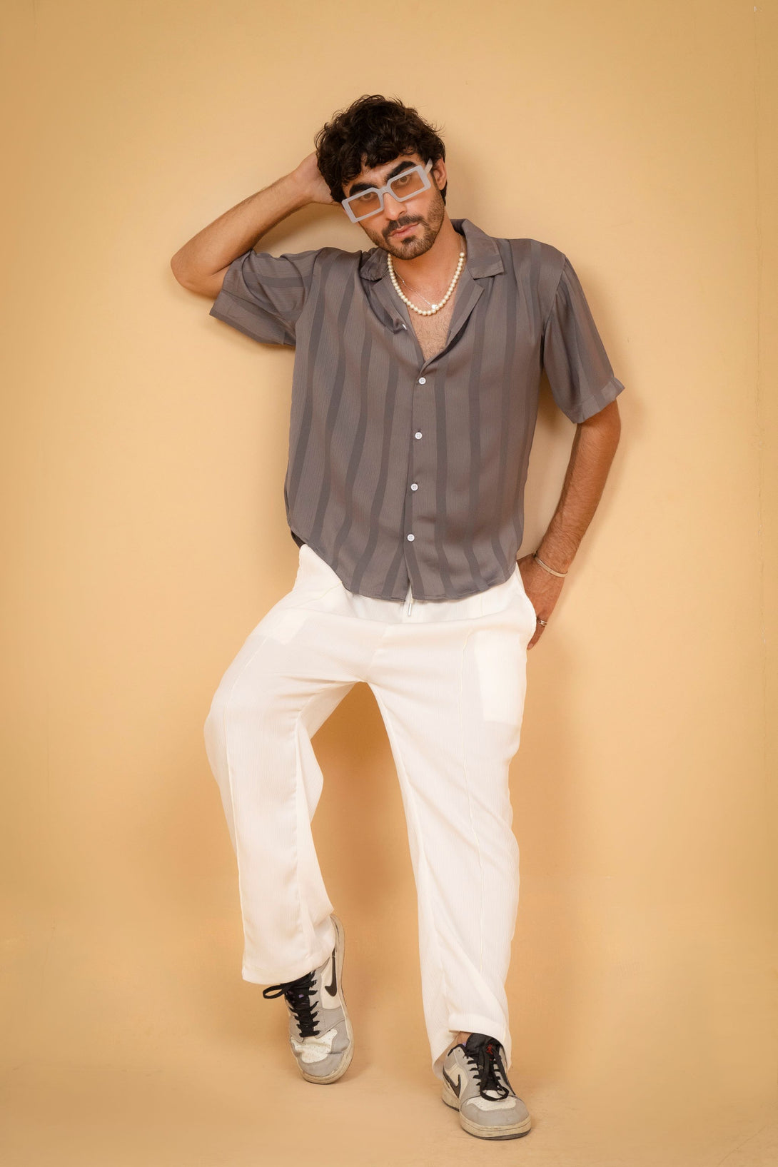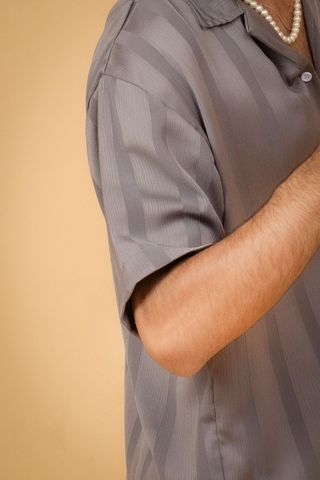 Collar: Features a relaxed, open collar style, often referred to as a Camp Collar or Cuban Sleeves: Short sleeves.
