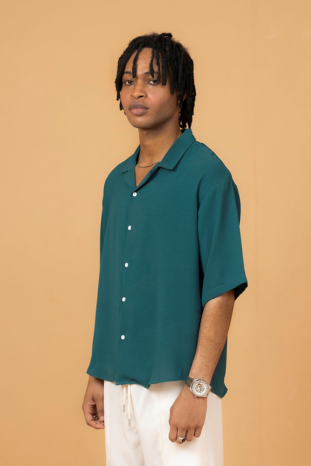 Cuban/Camp collar. It has a distinctively relaxed and slightly oversized fit with loose-fitting sleeves.