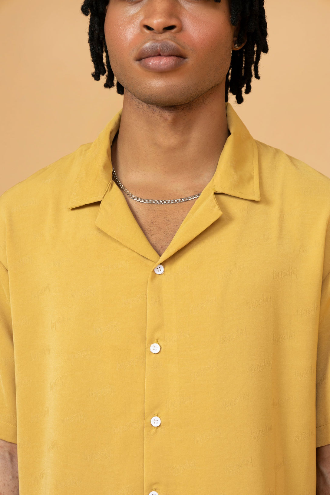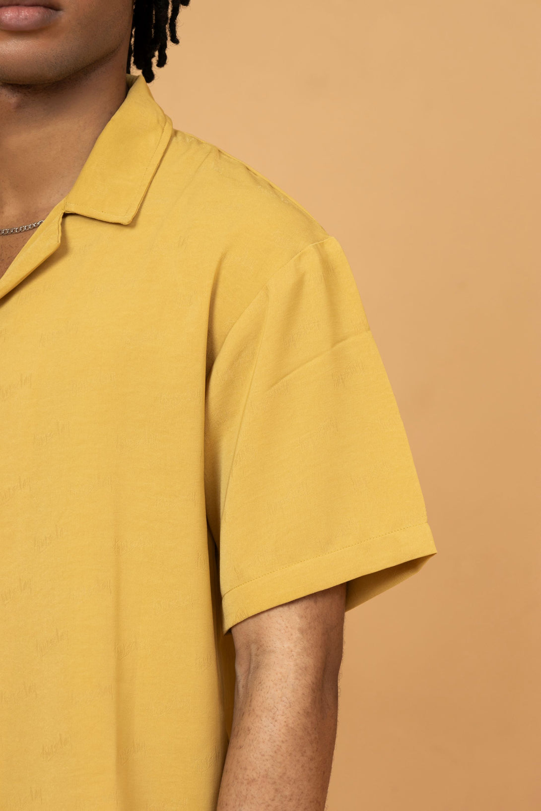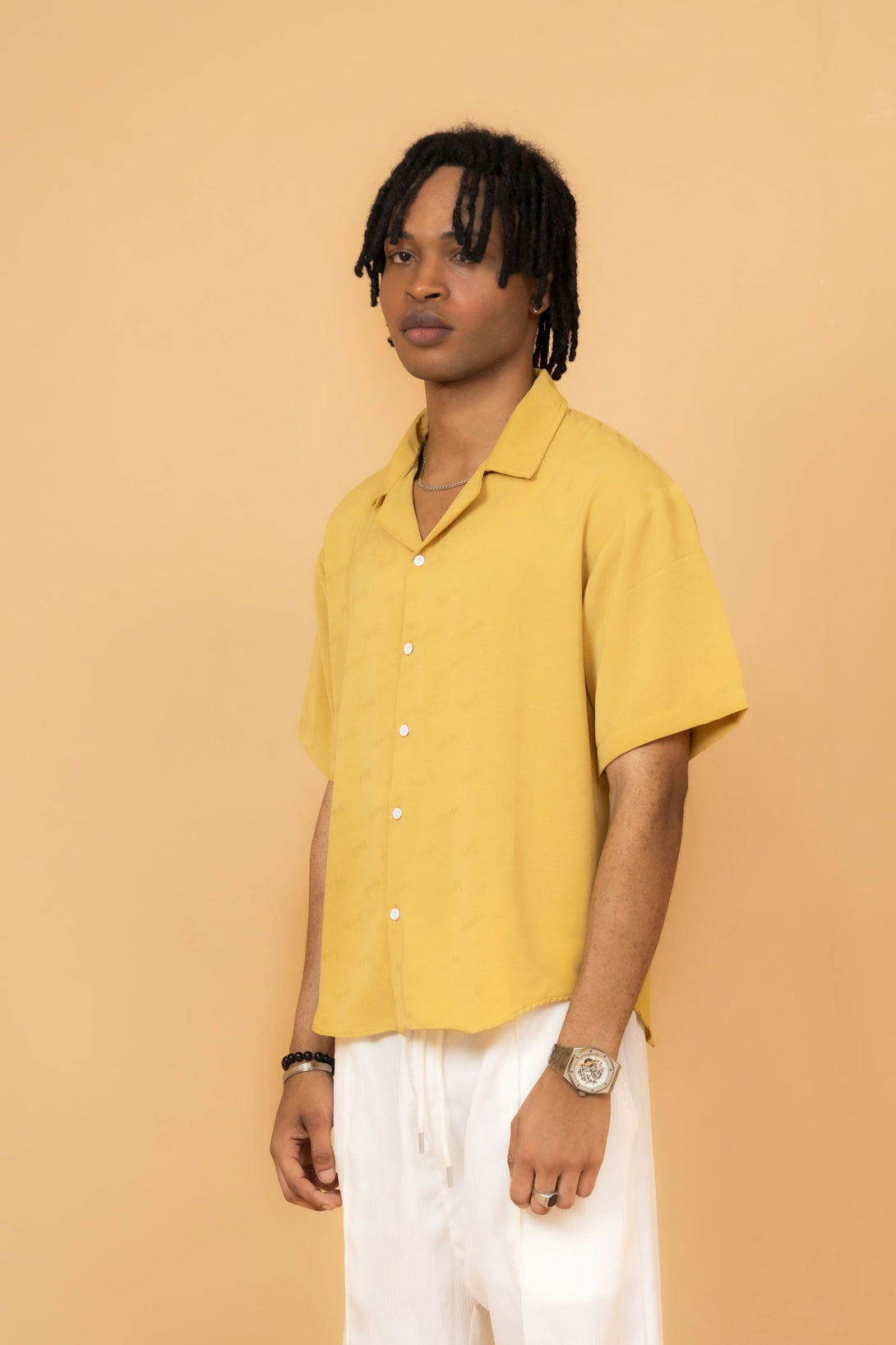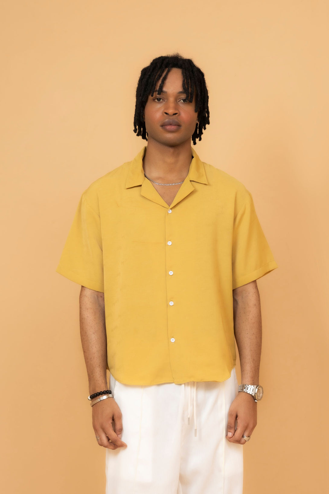 Style & Fit: Men's short-sleeved shirt with a casual, open Cuban/Camp collar. It has a relaxed and somewhat boxy fit with loose-fitting sleeves.
